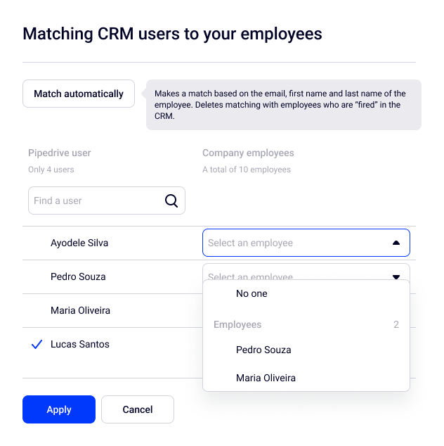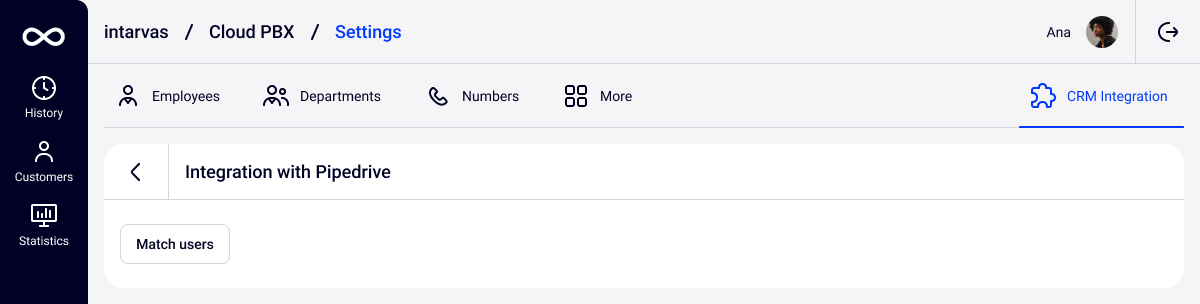 If you add new employees in the future, don’t forget to match their Cloud PBX and Pipedrive profiles in the integration settings in the Cloud PBX interface.