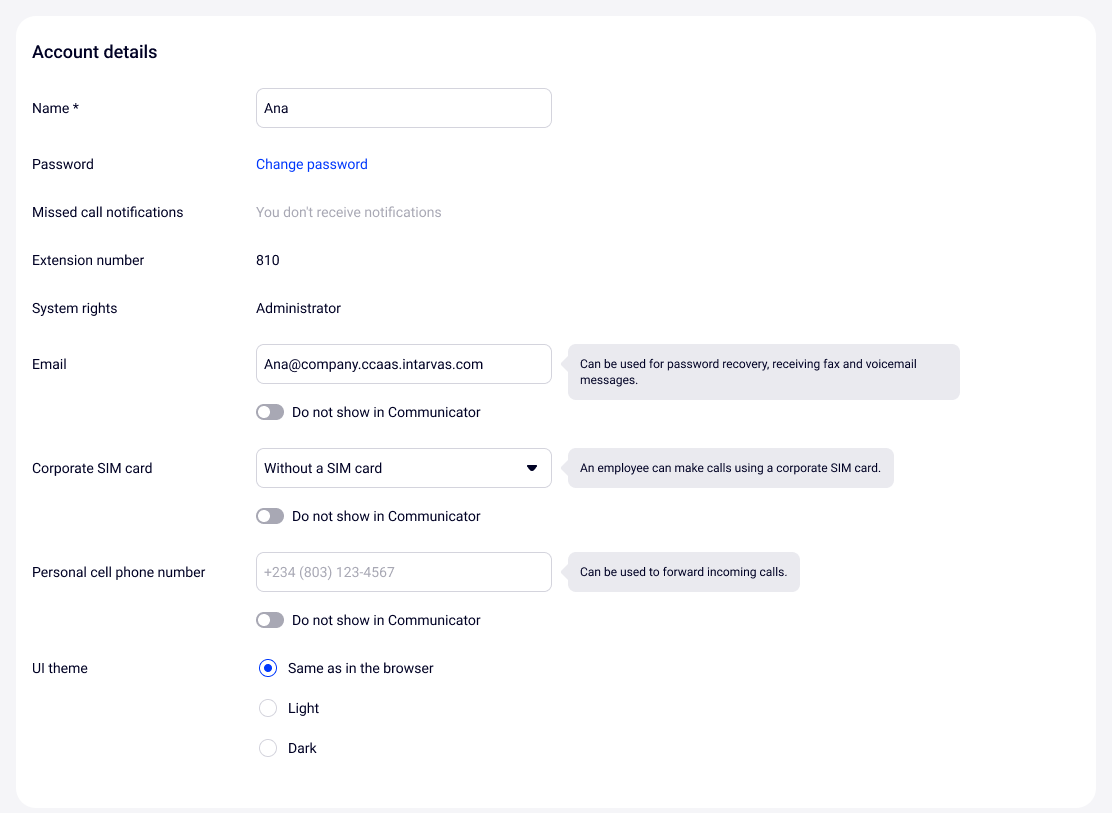 In the Account details section you can change your password for logging in to Cloud PBX and email address for password recovery and receiving messages.