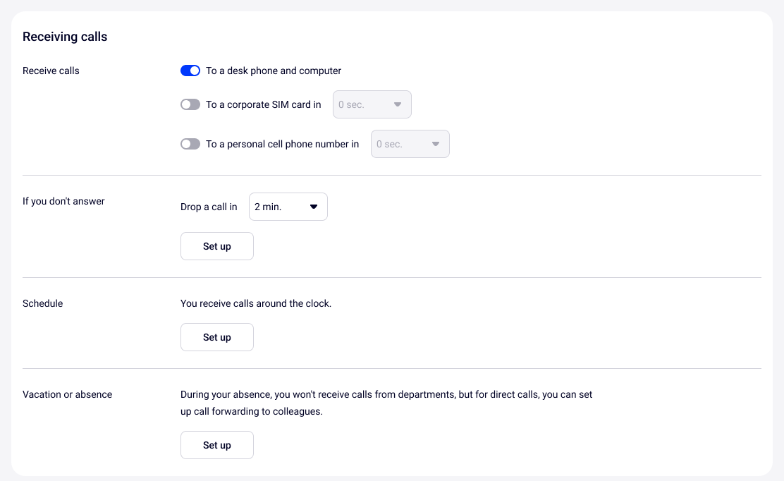 In the Receiving calls section you can set up important criteria for an employee's work, namely: