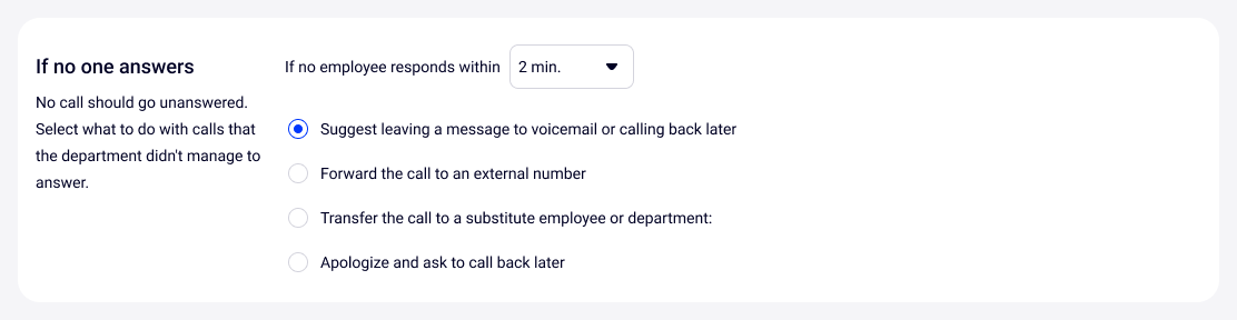 We recommend setting the waiting time to 10 minutes. If you set a shorter waiting time, such as 30 seconds, employees may not have enough time to handle the callback, and the customer will receive a message that the department is unavailable and will be offered to leave a voicemail.
