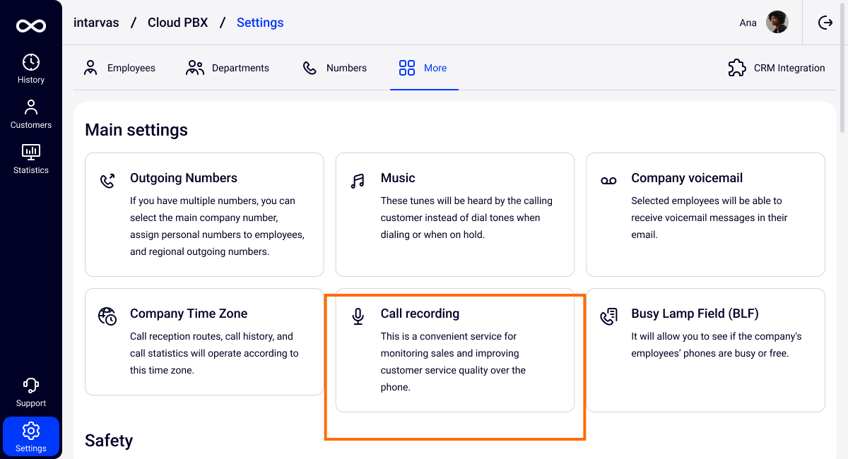 You can temporarily disable Call Recording if it is required for a special case. Please note that disabling recording in this section does not stop billing but only allows you to temporarily disable it. If you want to disable recording permanently, disable it in the Plan section.