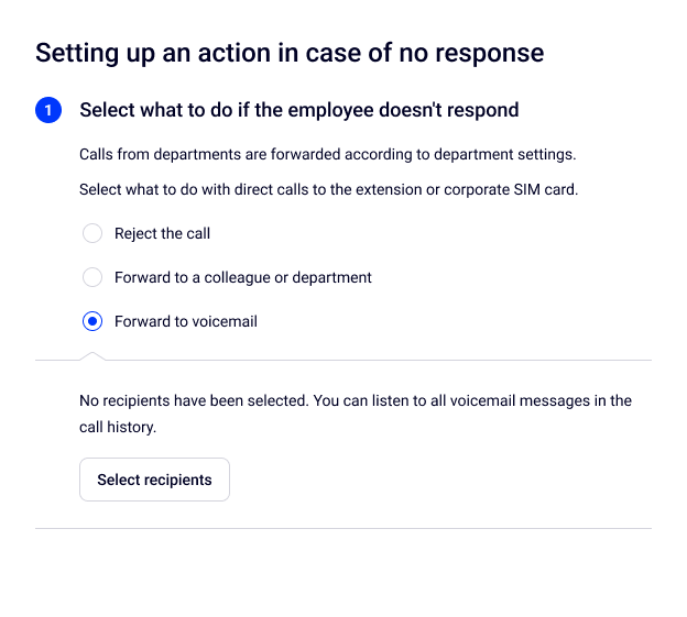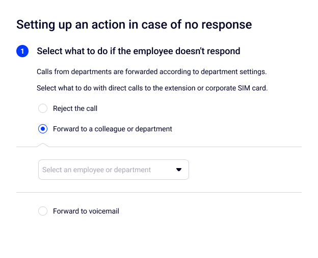 If an employee cannot pick up the phone quickly, this is not a reason to lose direct calls to their number. When a customer calls an employee directly by an extension number and waits a long time for a response, this call can be automatically forwarded to another employee or department. In this case, Cloud PBX will warn the customer that their call will be answered not by a familiar employee but by someone else.