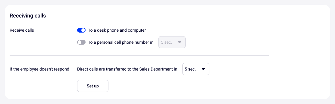 Make sure you have correctly set up forwarding of direct calls to the employee. If something needs correcting, click Set up again. If everything is correct, click Save in the profile settings.