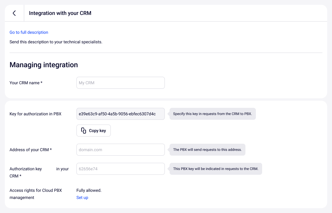 If your CRM is not listed among the available integrations, you can request our specialist specifying the desired CRM. We will update you on the estimated integration timeline.