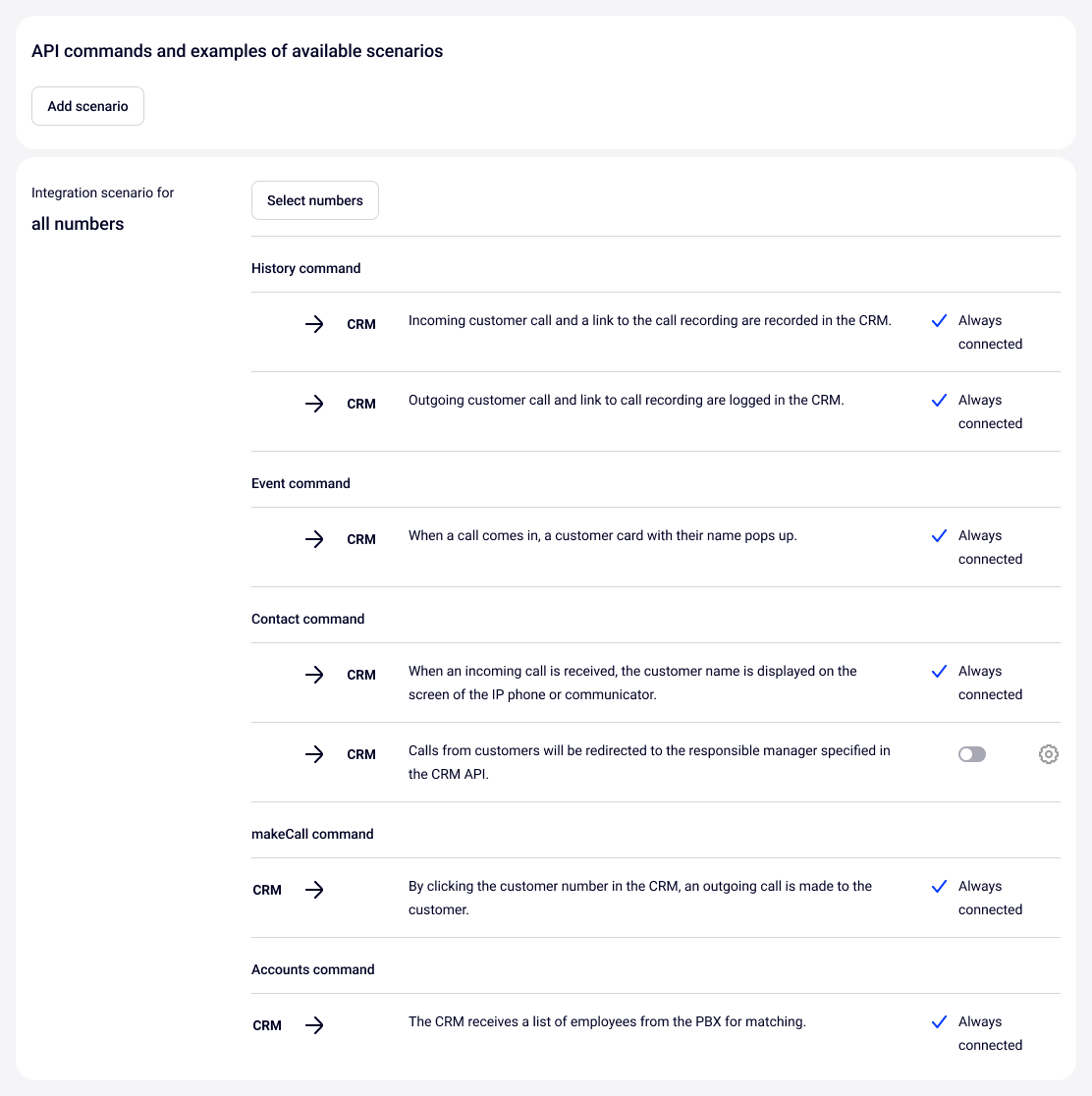 - Guide to modifying the list of numbers in integration scenarios to set up custom integration scenarios for selected numbers different from the main scenario.
