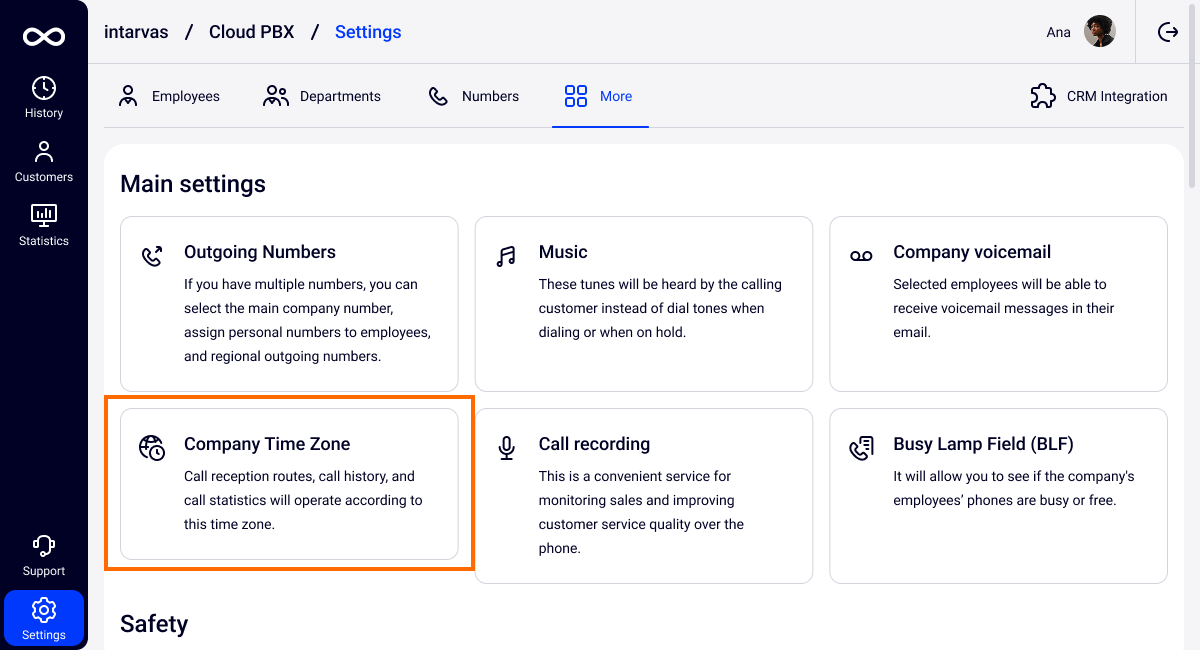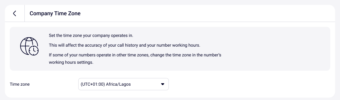 The company time zone is set up for all Cloud PBX numbers and all employees at once. This is done so that the employees working in different time zones do not get confused about the time.For example, colleagues from branches in different time zones when discussing specific calls will be able to use the company time zone instead of the local time in order to quicker and easier find the required conversation in History.